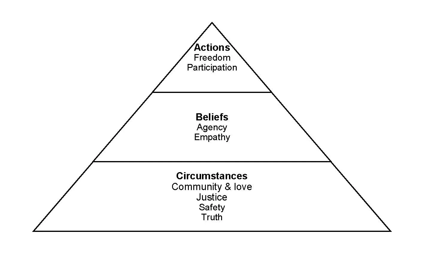 The base of the hierarchy is ‘truth’, as without a shared understanding of the situation we are in, it becomes incredibly difficult to agree how to move forward as a society. For example, if we don’t agree that climate instability is a threat which needs to be addressed, maintaining our safety becomes difficult.