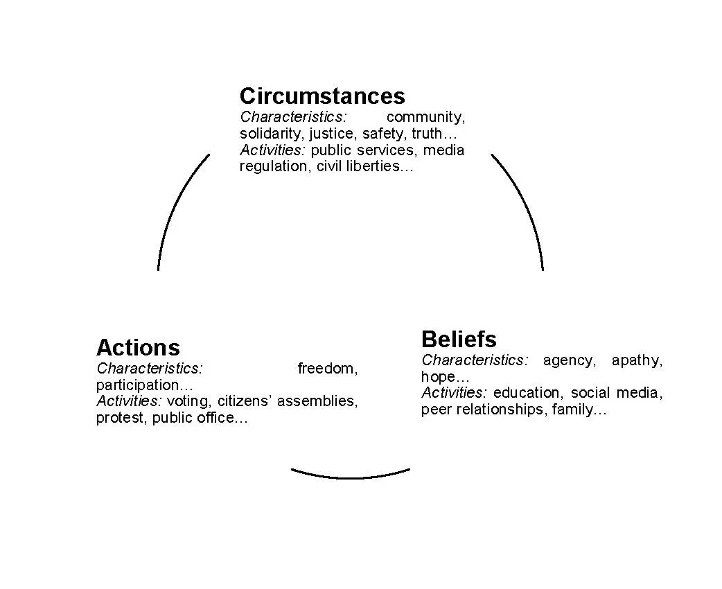 Crucially, if we recognise democracy as a system of interconnected institutions that govern our daily lives, from the justice system to our media culture, we can better appreciate the impact they have on our life circumstances, and therefore the beliefs we hold, and the actions we feel are possible. I call this the cycle of democratic culture.