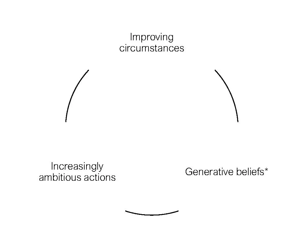 Social Cognitive Theory starts with our life circumstances: who we meet, what information we consume, how we make a living, and so on. Whatever circumstances we experience influence the beliefs we hold, which in turn drive our actions. The actions we take then shape our life circumstances going forward, and so the cycle keeps going.