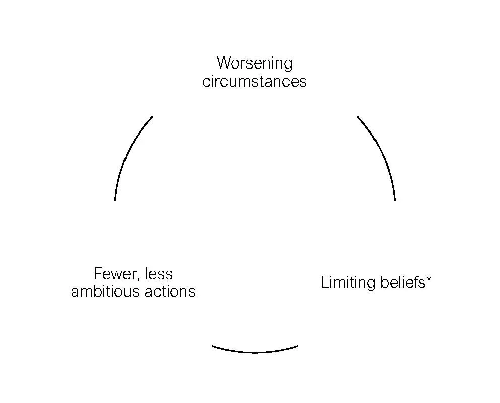 This cycle can be positive (Figure 2) or negative (Figure 3). A good democratic culture happens when the institutions people interact with improve their life circumstances, in turn boosting their empathy for others, and their confidence that acting on societal and personal challenges is possible and worthwhile. This enables them to undertake increasingly ambitious and effective actions that are aligned with both the big challenges of their generation, and with their own purpose.